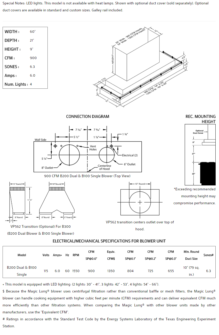 Double rectangle with galley rail styling. Click on the models for a list of our base model numbers for standard sizes; simply select the model you need, and then specify the finish (painted or stainless steel). Not available in real brass, real copper, or hammered copper. Recommended mounting height 27" above the cooking surface. Shown with matching wall mount duct covers (sold separately), available in standard sizes for 7', 8', and 9' ceiling heights or in custom sizes. All Vent-A-Hood products are suitable for use in damp locations (outdoor applications such as a covered patio) when installed in a GFCI protected branch circuit.