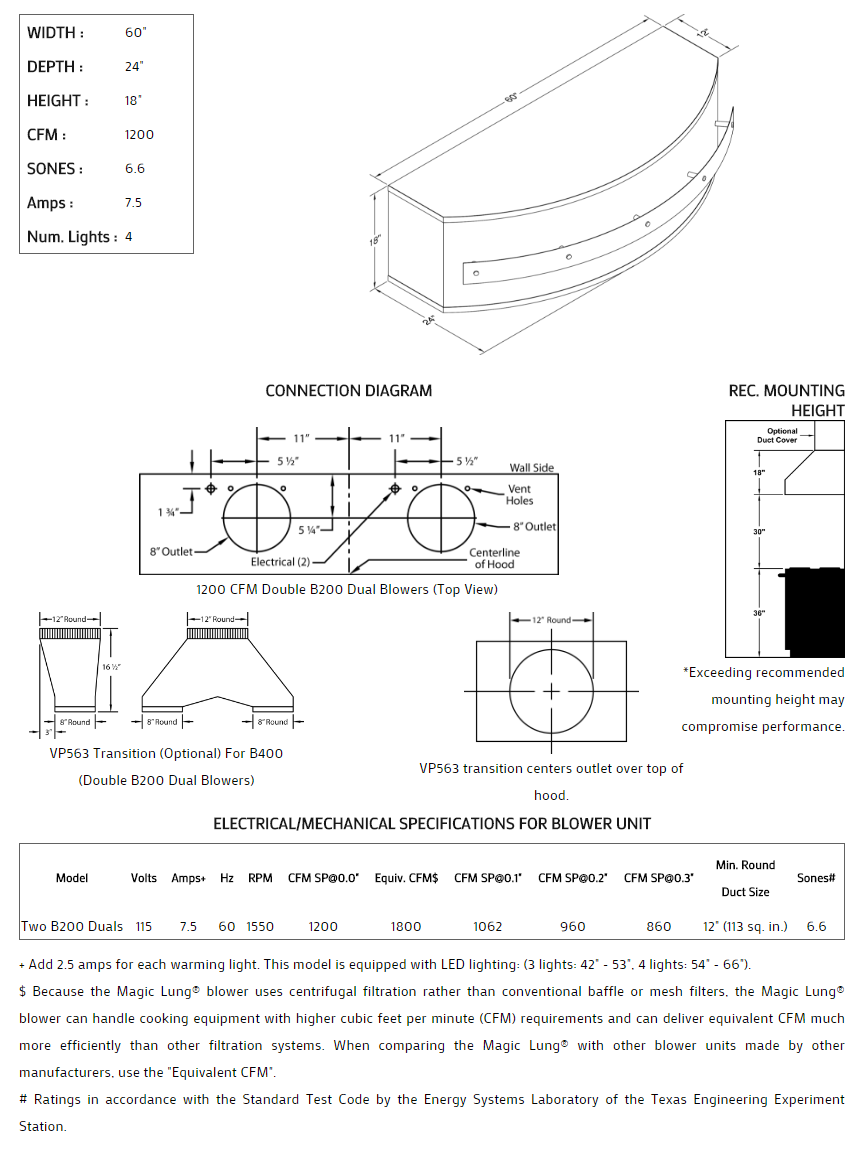 Rounded front with stand-off trim styling. Click on the models for a list of our base model numbers for standard sizes; simply select the model you need. This model is available in stainless steel with standard mirror stainless trim. All Vent-A-Hood Magic Lung products are suitable for use in damp locations (outdoor applications such as a covered patio) when installed in a GFCI protected branch circuit. Recommended mounting height is 30" above the cooking surface.