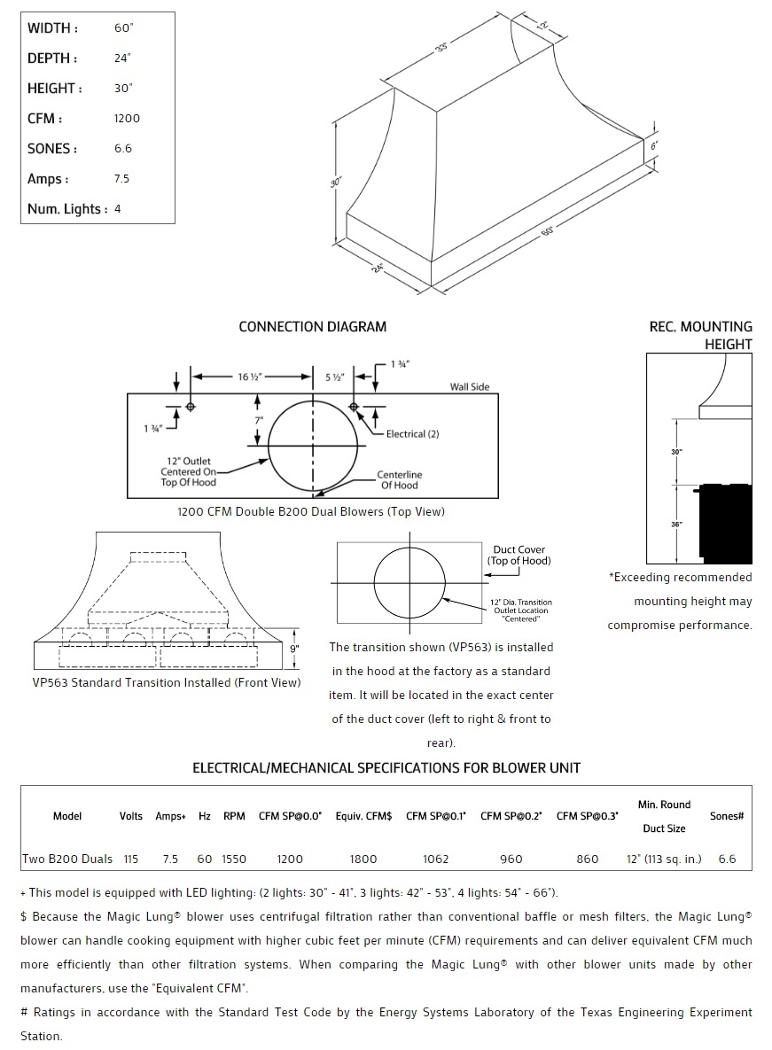 Concave with thick lip styling. Click on the models for a list of our base model numbers for standard sizes; simply select the model you need. This model is available in stainless steel with standard mirror stainless trim. All Vent-A-Hood Magic Lung products are suitable for use in damp locations (outdoor applications such as a covered patio) when installed in a GFCI protected branch circuit. Recommended mounting height is 30" above the cooking surface.