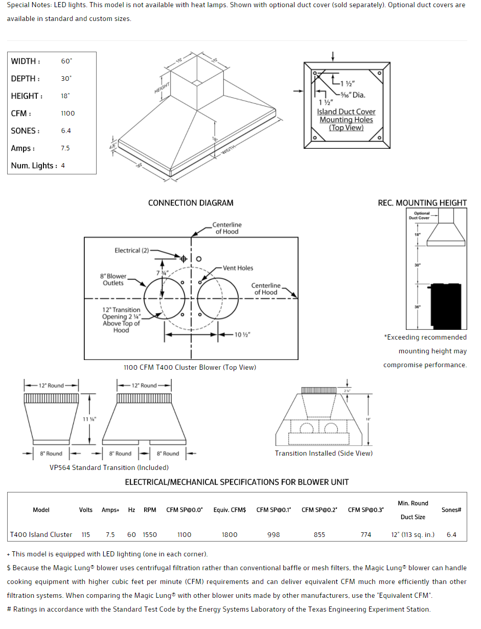 ** EQUIV CFM : Because the Magic Lung® blower uses centrifugal filtration rather than conventional baffle or mesh filters, the Magic Lung® blower can handle cooking equipment with higher cubic feet per minute (CFM) requirements and can deliver equivalent CFM much more efficiently than other filtration systems. When comparing the Magic Lung® with other blower units made by other manufacturers, use the “Equivalent CFM”.
