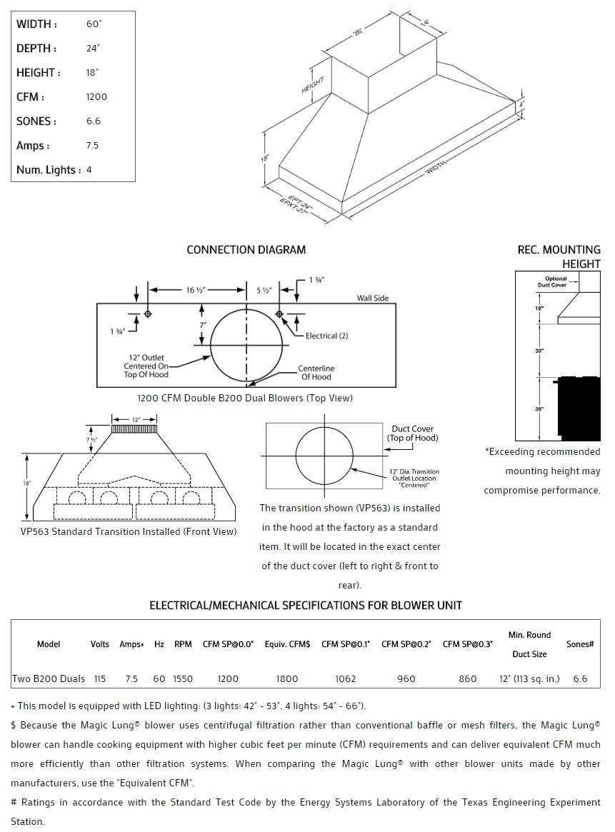 This Euroline Pro is boldly designed to cover light residential, "commercial type" cooking equipment. To order a 27" depth, add an 'X' after 'EP' in the model number. The Euroline Pro Series with Emerald Lip is also available with a 26" wide x 14" deep top to allow for higher CFM requirements . Heat lamps are not available on this model. Click on the models for a list of our base model numbers for standard sizes; simply select the model you need, and then specify the finish (painted, stainless steel, real brass, real copper, or hammered copper). Recommended mounting height is 30" from the cooking surface. Shown with matching wall mount duct cover (sold separately), available in standard sizes for 8', 9', and 10' ceiling heights or in custom sizes. All Vent-A-Hood products are suitable for use in damp locations (outdoor applications such as a covered patio) when installed in a GFCI protected branch circuit.