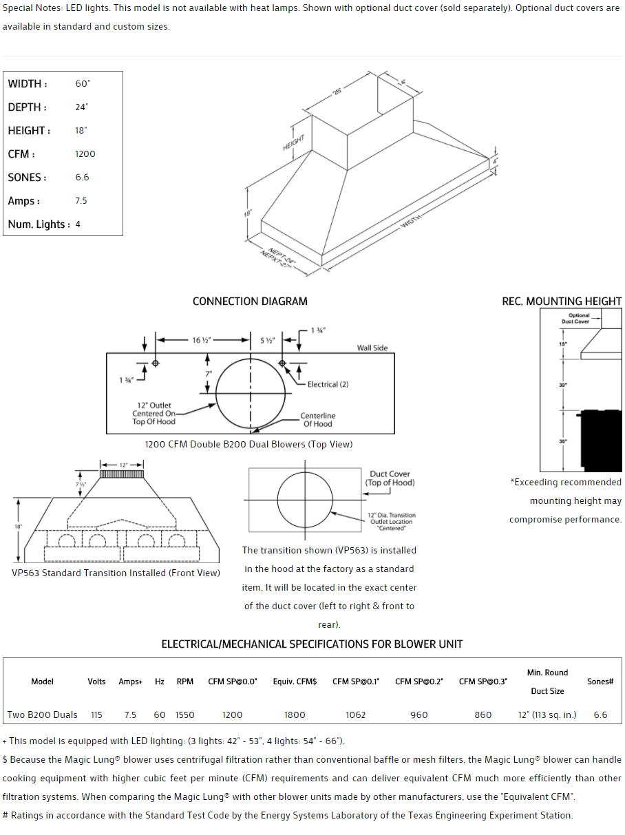 This Euroline Pro is boldly designed to cover light residential, "commercial type" cooking equipment. To order a 27" depth, add an 'X' after 'EP' in the model number. The Euroline Pro Series with Emerald Lip is also available with a 26" wide x 14" deep top to allow for higher CFM requirements . Heat lamps are not available on this model. Click on the models for a list of our base model numbers for standard sizes; simply select the model you need, and then specify the finish (painted, stainless steel, real brass, real copper, or hammered copper). Recommended mounting height is 30" from the cooking surface. Shown with matching wall mount duct cover (sold separately), available in standard sizes for 8', 9', and 10' ceiling heights or in custom sizes. All Vent-A-Hood products are suitable for use in damp locations (outdoor applications such as a covered patio) when installed in a GFCI protected branch circuit.
