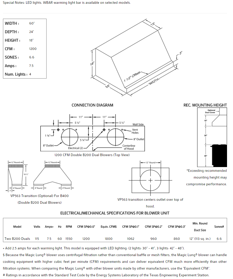 ** EQUIV CFM : Because the Magic Lung® blower uses centrifugal filtration rather than conventional baffle or mesh filters, the Magic Lung® blower can handle cooking equipment with higher cubic feet per minute (CFM) requirements and can deliver equivalent CFM much more efficiently than other filtration systems. When comparing the Magic Lung® with other blower units made by other manufacturers, use the “Equivalent CFM”.