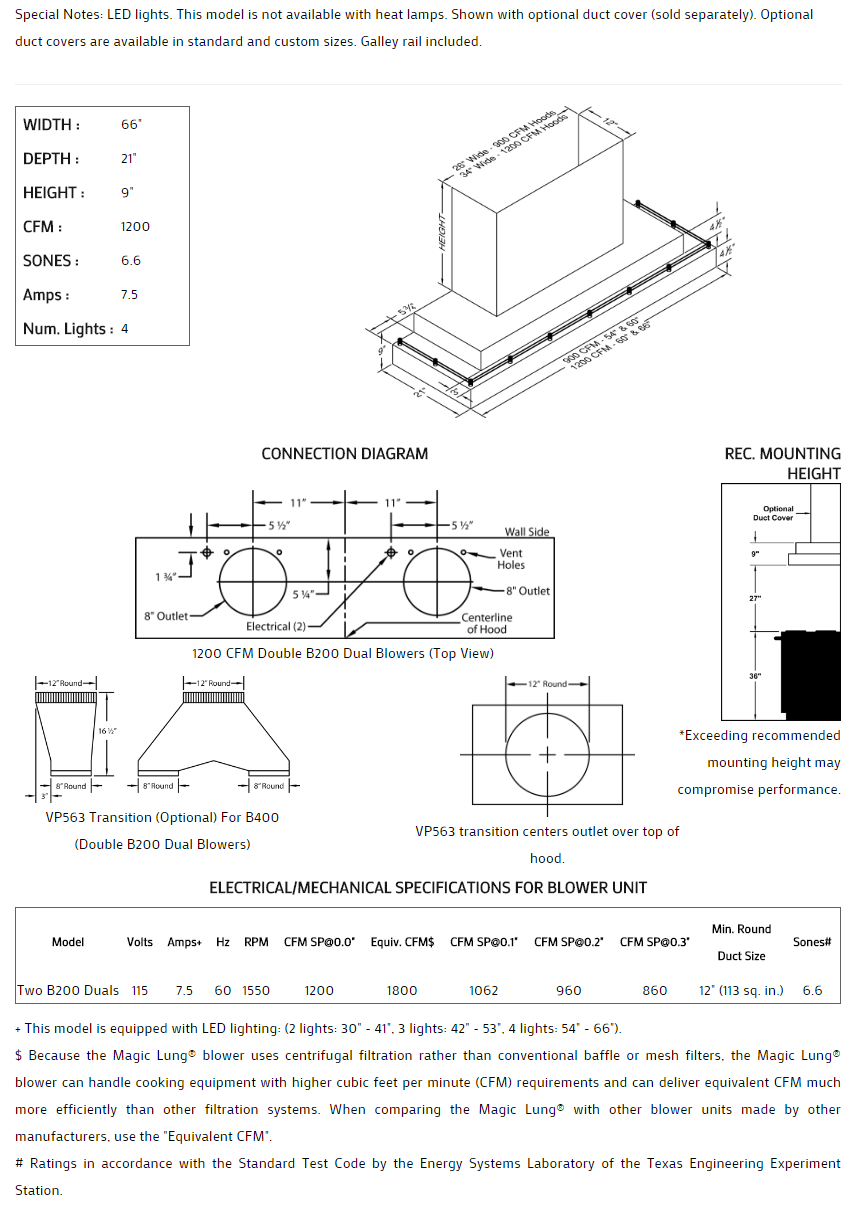 Double rectangle with galley rail styling. Click on the models for a list of our base model numbers for standard sizes; simply select the model you need, and then specify the finish (painted or stainless steel). Not available in real brass, real copper, or hammered copper. Recommended mounting height 27" above the cooking surface. Shown with matching wall mount duct covers (sold separately), available in standard sizes for 7', 8', and 9' ceiling heights or in custom sizes. All Vent-A-Hood products are suitable for use in damp locations (outdoor applications such as a covered patio) when installed in a GFCI protected branch circuit.