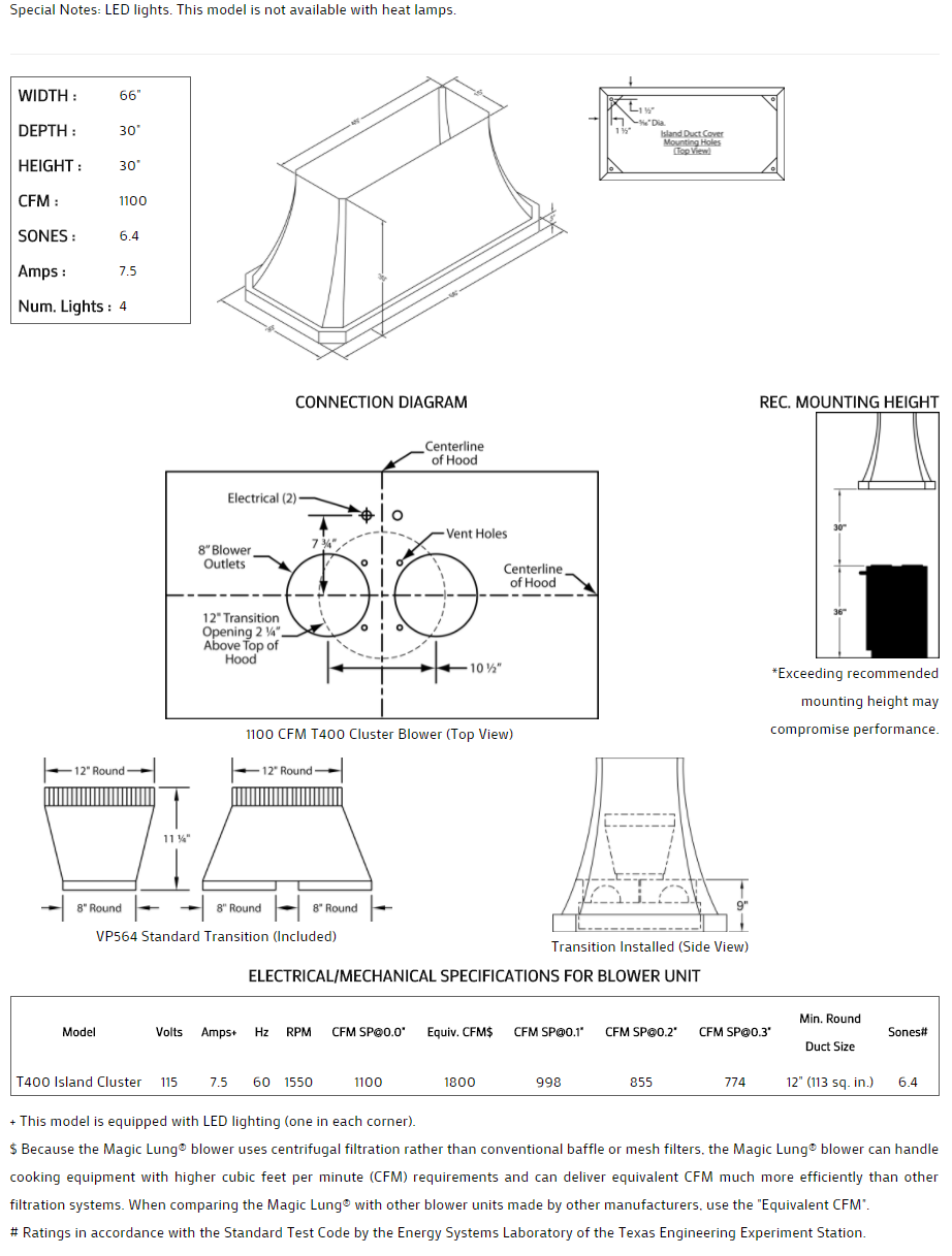Concave with lip styling. Click on the models for a list of our base model numbers for standard sizes; simply select the model you need. This model is available in stainless steel with standard mirror stainless trim. All Vent-A-Hood Magic Lung products are suitable for use in damp locations (outdoor applications such as a covered patio) when installed in a GFCI protected branch circuit. Recommended mounting height is 30" above the cooking surface.