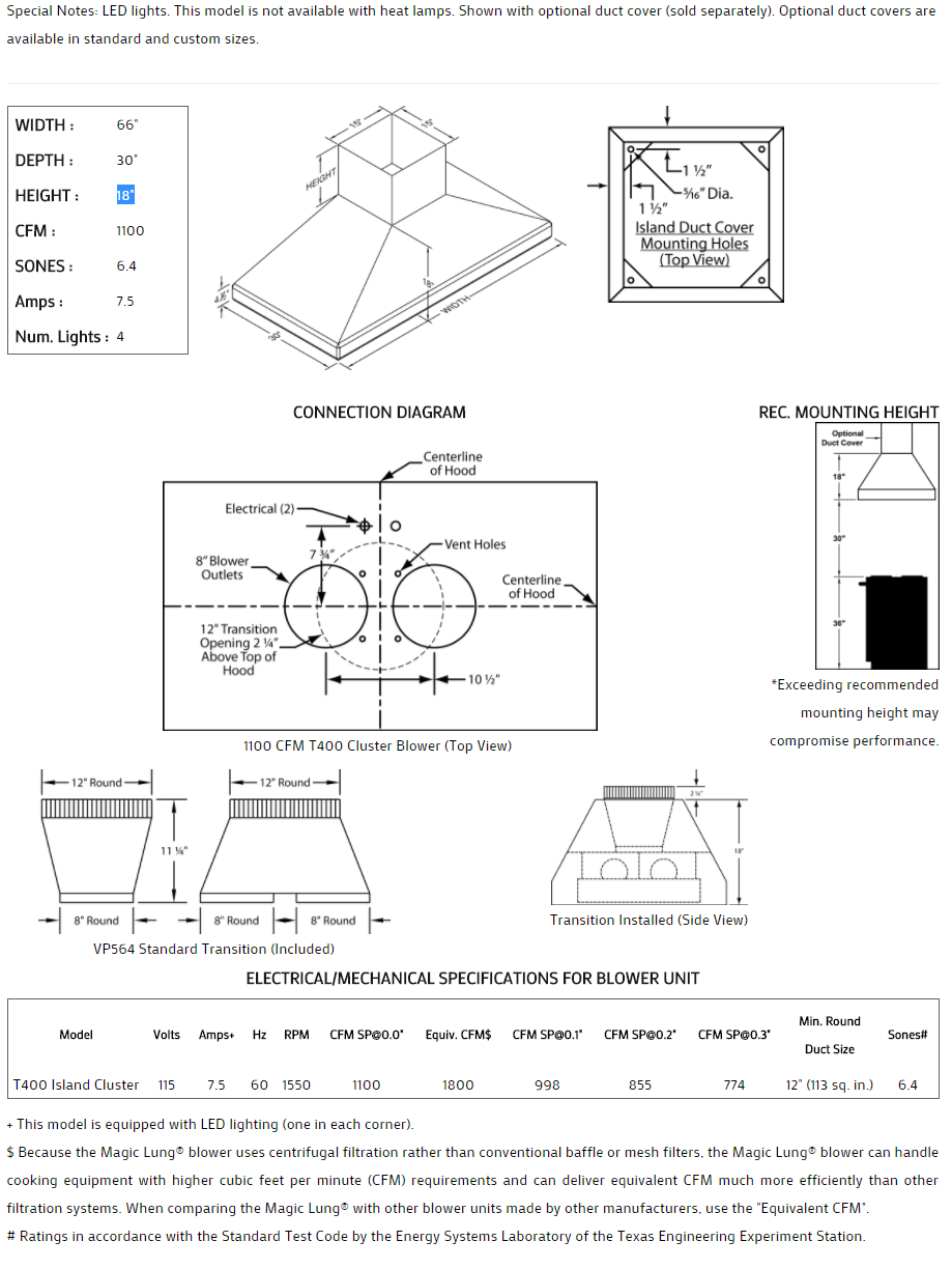 ** EQUIV CFM : Because the Magic Lung® blower uses centrifugal filtration rather than conventional baffle or mesh filters, the Magic Lung® blower can handle cooking equipment with higher cubic feet per minute (CFM) requirements and can deliver equivalent CFM much more efficiently than other filtration systems. When comparing the Magic Lung® with other blower units made by other manufacturers, use the “Equivalent CFM”.