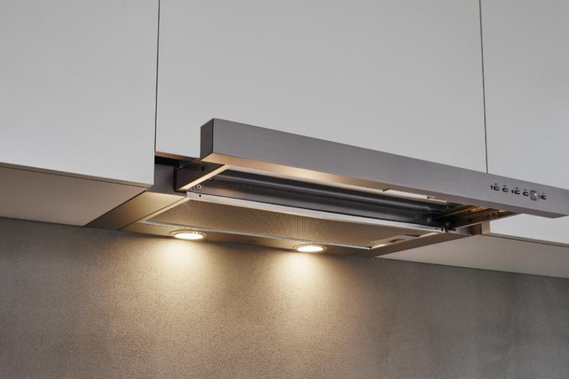 Powered by a 300 CFM motor with three power settings, this telescopic hood extends almost 7" from the cabinet when in operation. It comes with aluminum mesh filters, easily removable and dishwasher safe. Two LED lights provide bright illumination of the cooking surface under the hood. It is installed inside the upper cabinet above the cooking surface and can be vented out or recirculated.