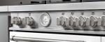 The 4.7 cubic feet main oven cavity is the largest in its class, with dual convection fan for balanced airflow and even temperature baking and roasting on 7 shelf levels. The elegant large temperature gauge monitors the actual temperature in the oven. The extra wide infrared gas broiler is ideal for grilling and searing at high heat. The 2.4 cubic feet auxiliary oven is perfect for smaller dishes and for warming. Both ovens include convenient soft-motion doors. The edge-to-edge interior oven glass door maximizes interior volume and can be wiped clean without effort.