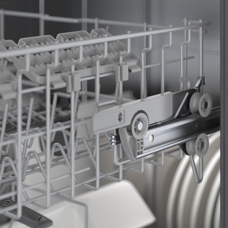 RackMatic® easily adjusts to three different heights and up to nine separate rack positions, allowing taller items like stemware to fit in the middle rack while leaving room for pots and pans below.