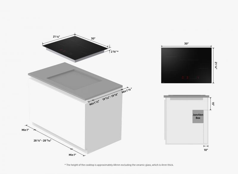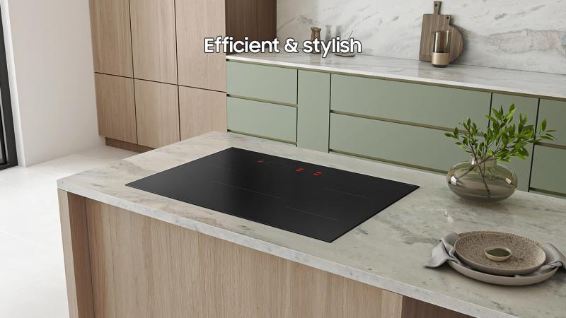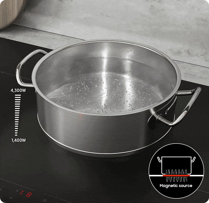 * Based on internal testing in the Samsung Kitchen Lab. Test conditions: 3420g of water at 25°C brought to the boil at 90°C using 2.5kW output. Test results for the time elapsed: Induction cooktop (CC70F36S2DAA) = 8' 58" using 361.8W, Radiant cooktop (NZ30FG5332RKAA) = 9' 59" using 398.13W. ** Total output available is 7.1kW for the 30" model.