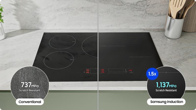 * Based on testing by Samsung in accordance with ASTM G133-95, compared to the Samsung model NZ30A3060UK/AA with conventional glass. Results provided to and interpreted by Intertek. The test involves scratching on the cooktop with a stainless steel ball, with a 6mm diameter and made of SUS304 material, back and forth 10 times with increasing pressure (MPa), and then checking the surface with both the naked eye and a microscope to determine when a scratch is visible.