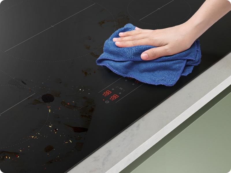 Keep the cooktop looking neat. Its smooth ceramic glass surface has a non-stick coating, so if there is spilled food, sauce splatters or grease stuck on the surface you can wipe the mess away with a cloth. It also has a special Fingerprint Resistant Finish that allows for fingerprint marks to be quickly wiped away with a damp cloth .
