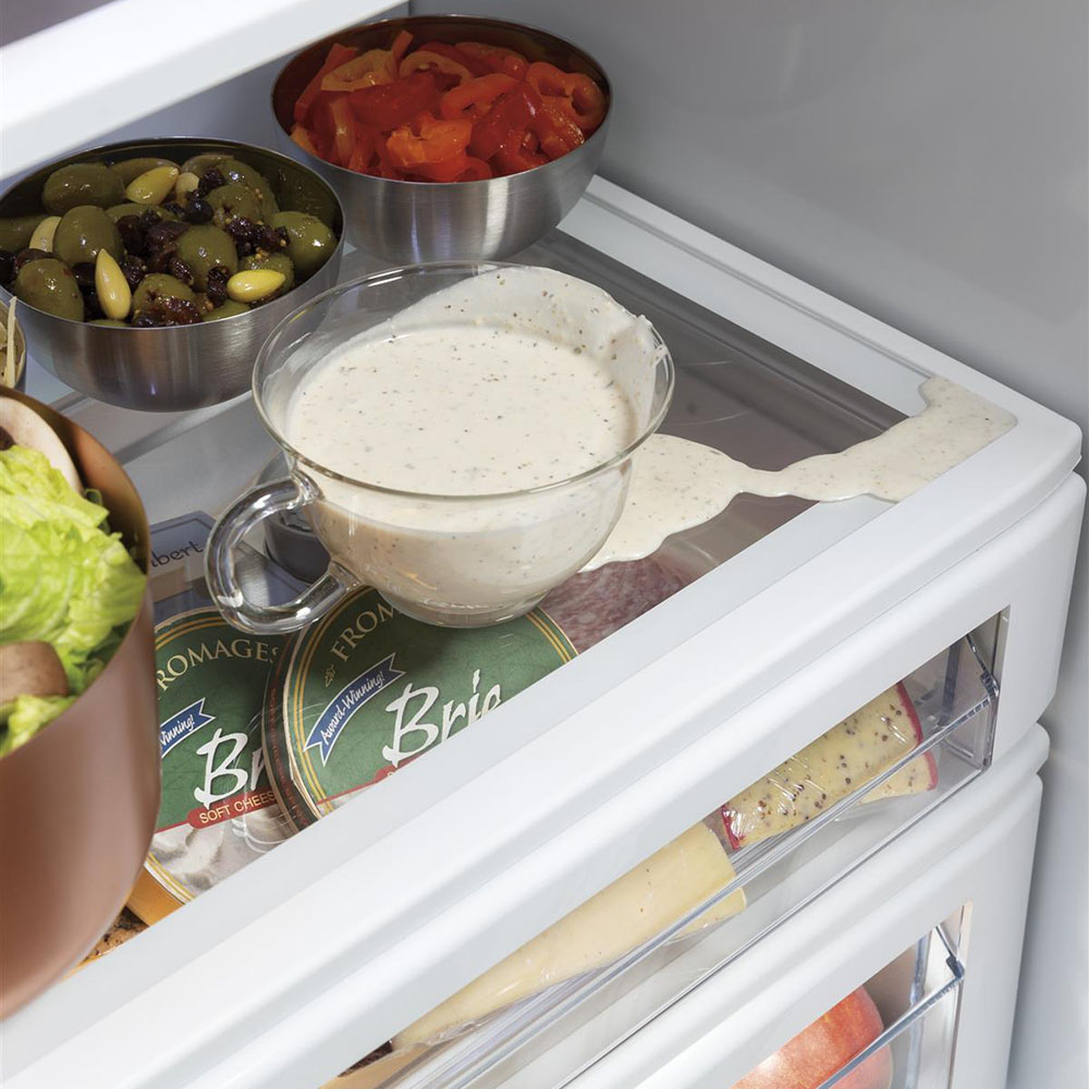 Spills happen, but cleanup is stress-free thanks to adjustable slide-out, spillproof glass shelves that easily shift and lock, and have raised edges to contain mess.