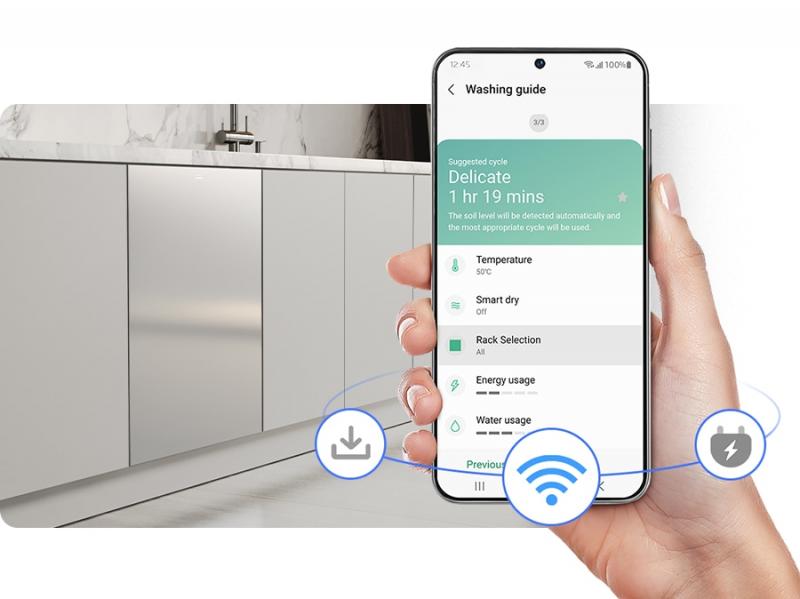Improve how you use the dishwasher to suit your lifestyle. The SmartThings App* lets you remotely monitor and control it on a smartphone. It also suggests washing types and modes to use based on how you cook**, while helping you monitor energy use, manage consumables*** and diagnose and resolve errors.