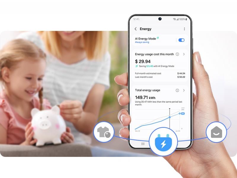 * Available on Android and iOS devices. A Wi-Fi connection and a Samsung account are required.** Based on internal testing on a DW90F89****** model to measure the energy consumption of the Auto program with and without using AI Energy mode, in accordance with the AHAM DW-1-2020 and AHAM DW-2-2020 standards. Result: Auto program = 724Wh and Auto program with AI Energy mode = 470Wh, which is a reduction of 35%. Results may vary depending on the actual usage conditions. AI Energy mode can be used with 6 washing cycles: Intensive, Express, Extra Silence, Pots & Pans, Plastic and Auto.