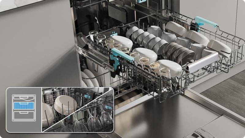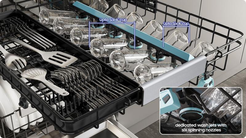 Clean cutlery, utensils and drinkware easily, effectively and space efficiently*. An upgraded 3rd Rack washing system is a dedicated area to put cutlery and utensils. There is also an area to put drinkware, which has dedicated wash jets with six spinning nozzles that remove residue thoroughly.