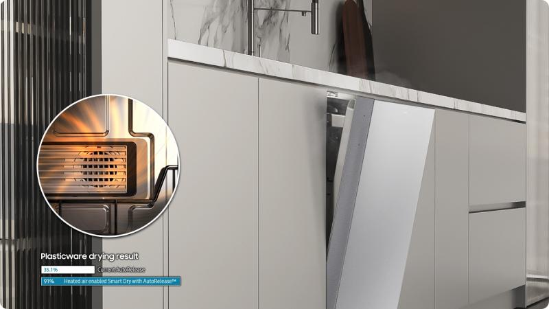 Dry dishes with heated air enabled Smart Heat Dry with AutoRelease™. It absorbs moisture and circulates high temperature air at 212ºF, so it delivers powerful drying performance. Also, when cycles end, the door opens automatically to let steam escape, enabling fast and easy drying.