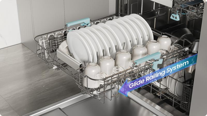 Pull out a basket full of dishes easily and safely. The Glide Railing system creates less friction, so the middle rack slides in and out smoothly. You can load or unload a basket full of dishes with hardly any effort, even if it contains heavy pans.