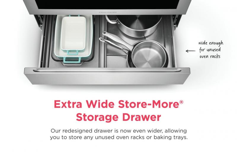 Our redesigned Store-More Storage drawer is now even wider - allowing you to store any unused oven racks or baking trays.