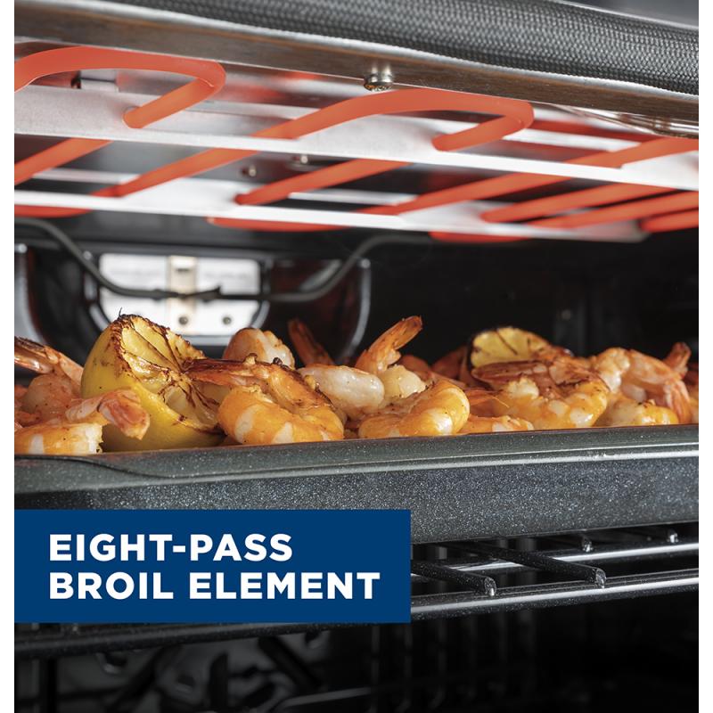 Even baking and quick cleanup are assured, with 10-pass element that heats a large cooking area and is hidden for an easy-to-wipe surface