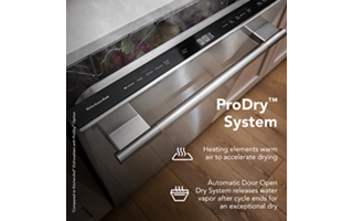 opens door 4" after the dry cycle ends to release water vapor and provide natural ventilation for an exceptional dry. Use the Automatic Door Open Dry System alone for our most energy-efficient dry* or pair with ProDry™ option for improved drying performance. *Compared to KitchenAid® Dishwashers when using ProDry™ Option.