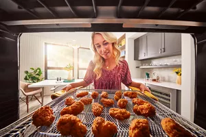 Get the crisp you crave, right from your oven. This 27" Combination Microwave Wall Oven with Air Fry Mode circulates hot air around the included basket to cook with less oil.* Microwave convection cooking turns the microwave into a second oven for small batch bakes like cookies, madeleines and cakes.*When compared to deep frying.