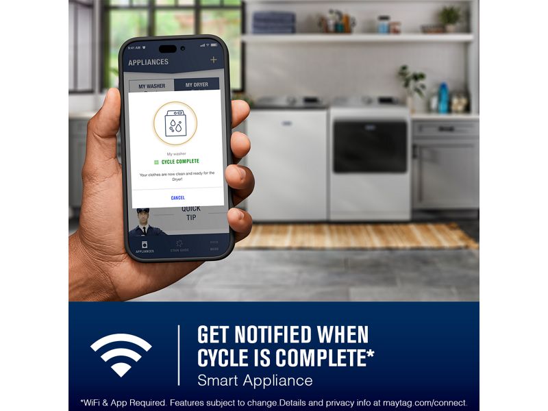 Stay on top of laundry with end of cycle notifications on your smart device to ensure finished loads aren’t left behind.*WiFi & App Required. Features subject to change. Details and privacy info at maytag.ca/connect.