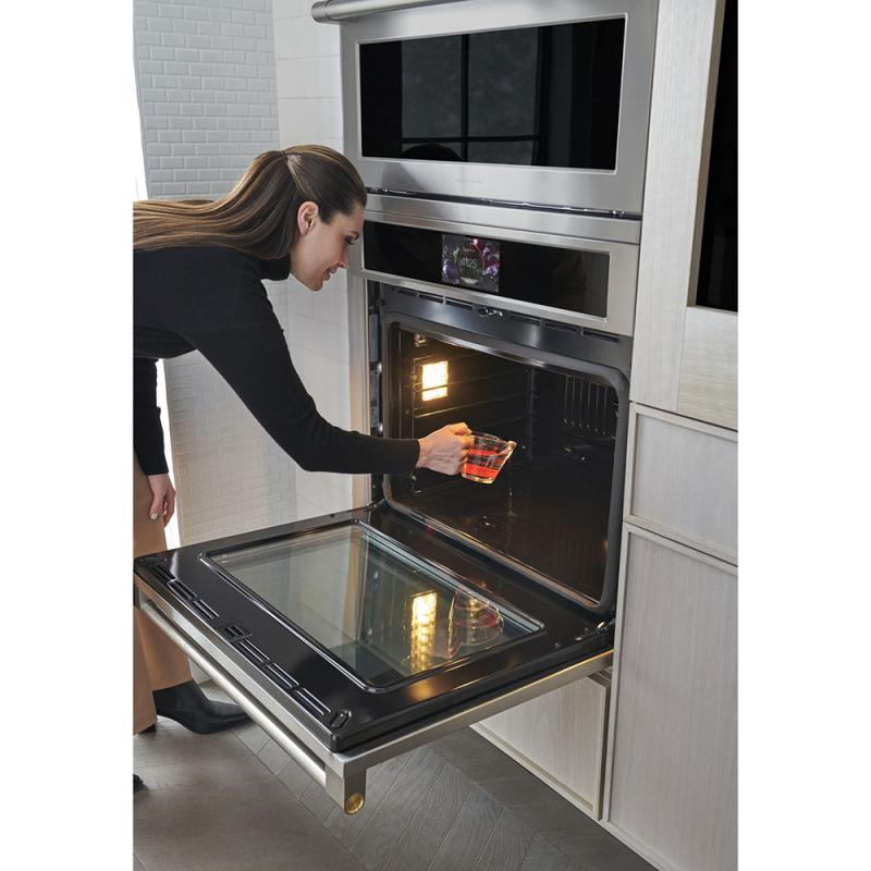 Sleek handle-less design now benefits from the convenience of voice control. Once programmed, you can use your voice to open the oven door, preheat the oven and more, all without raising a finger