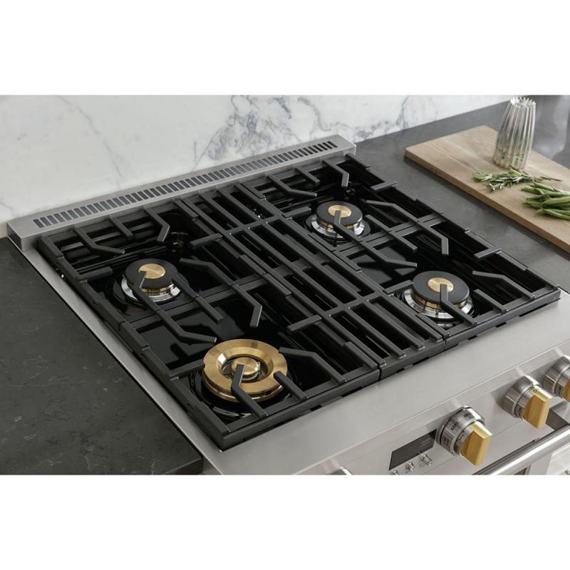 Delivering exceptional cooking flexibility, the 21,000-BTU multi-ring brass burner and dual-stack burners offer a range of heat settings, from gentle simmer to intense flame