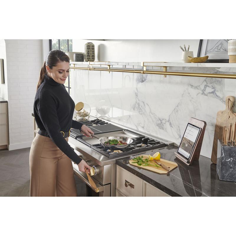 Delivering exceptional cooking flexibility, the 21,000 and 23,000-BTU multi-ring brass burners and dual-stack burners offer a range of heat settings, from gentle simmer to intense flame