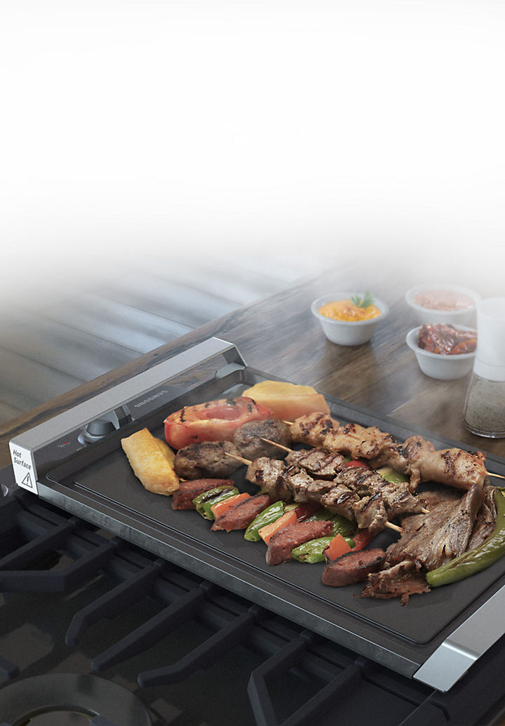 Included heavy-duty cast iron griddle with a wide surface is ideal for quickly and evenly sizzling, searing and sautéing. With stainless steel handles on both sides, it's easy to move and looks stylish.