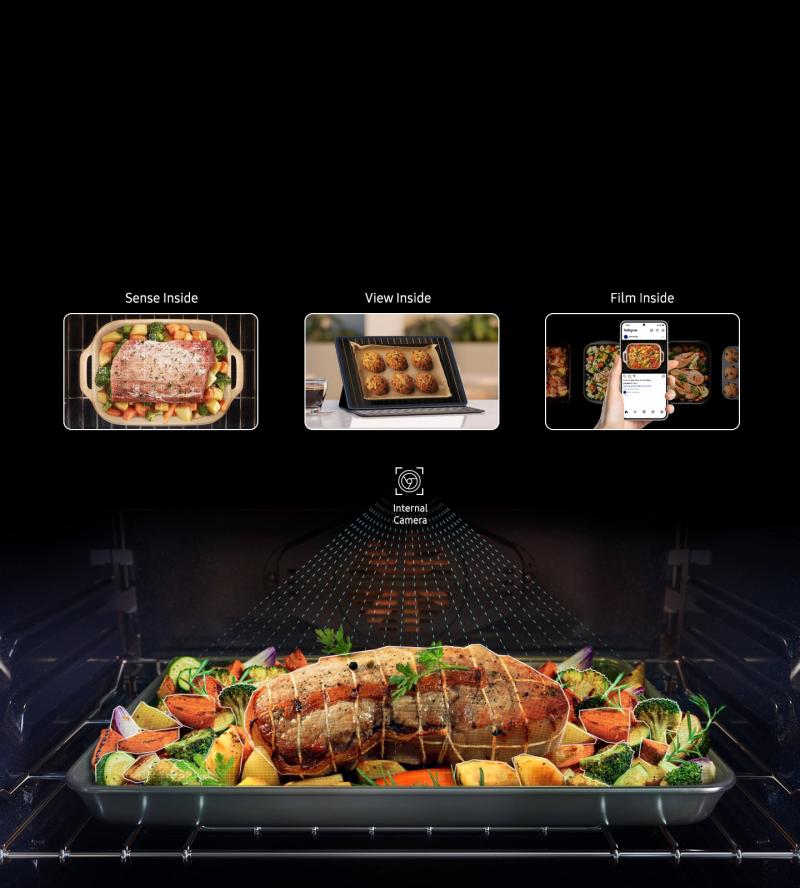 * Available on Android and iOS devices. A Wi-Fi connection and a Samsung account are required. ** Camera is located at the top of the oven; view of lower racks may be obstructed. For ingredient recognition, a single ingredient dish should be placed in the center of the oven, unobstructed. Keep camera lens clean. AI recognition accuracy depends on usage conditions; for more detailed information, please refer to the user guide.