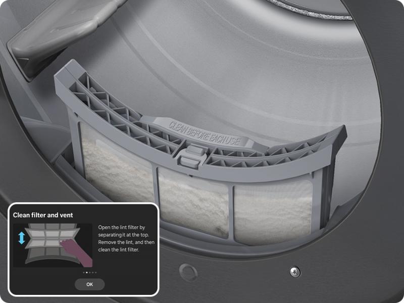When you turn on the dryer, the LCD display shows the Lint Filter Alert to remind you to check if it needs cleaning, so you can always keep your dryer clean.