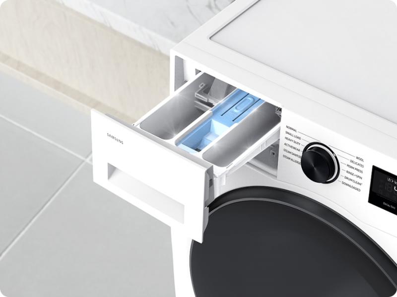Stop wasting detergent and avoid the tedious task of cleaning the detergent drawer. The StayClean Drawer helps ensure that more of the detergent is washed away with a specially designed water flushing system, so there is less unsightly soap residue and the tray stays effortlessly clean. 4