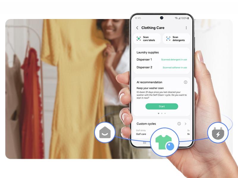 Enjoy personalized and efficient laundry. Clothing Care analyzes your usage and other factors to make recommendations and customize cycles. Using a detergent/softener’s bar code it sets the right amount. It suggests cycles based on care labels. And you can buy laundry supplies.