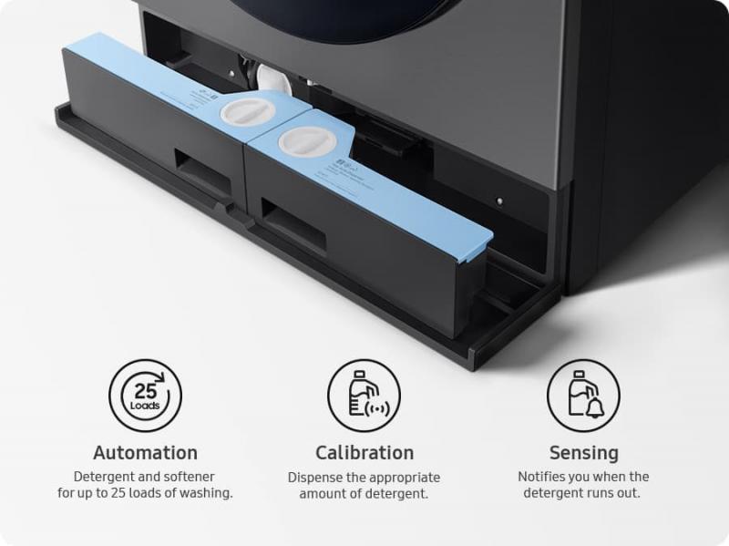 * Available on Android and iOS devices. A Wi-Fi connection is required. ** Stores user data, preferences and usage patterns to suggest the most useful options. *** The user will be solely responsible for any consequence(s) that may result, including but not limited to any damage or harm caused by incorrect information provided by the user. **** This function is only available when using liquid detergents and softeners made by P&G, including the detergent brands Tide, Gain, Dreft, Ariel, 9 Elements, Cheer, Era, Ivory and Ivory Snow and the softener brands Downy, Tide, Gain and 9 Elements, but it may not recognize certain items. Available in the U.S and Canada only. ***** To use Alexa Smart Reorder to buy supplies, you need to link SmartThings to Alexa and activate the Alexa Smart Reorder. Available in the U.S and Canada only.