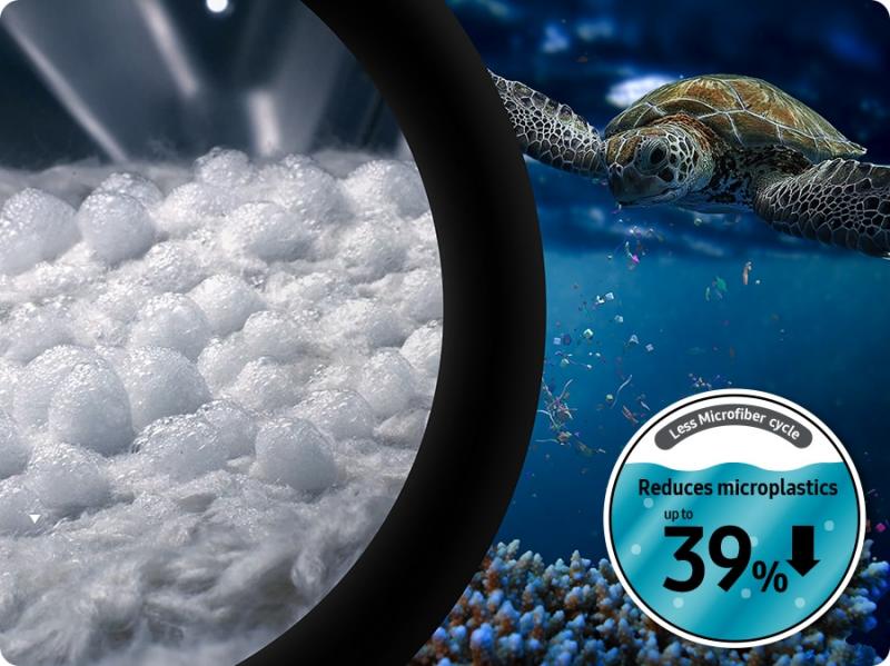 * Based on testing by the Ocean Wise Plastics Lab using a 2kg load of 100% polyester hoodies, comparing the Synthetics cycle on a Samsung conventional model 27" washing machine with US design and the Less Microfiber cycle. Results may vary depending on the actual clothes and usage conditions.