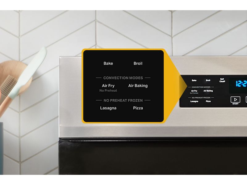| Oven Selections | Auto On, Bake, Broil, Cancel/Off, Clock, Control Lock, Convect Modes, Cook Time Indicator, Delay Start, Frozen Bake, Keep Warm/Warm Hold, No Preheat - Air Fry, Sabbath Mode, Start Time, Stop Time, Timer |