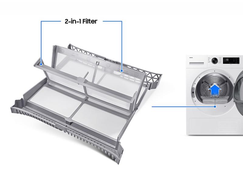Maintain your dryer more easily and optimize the drying performance and safety. An innovative 2-in-1 Filter has a two-layered mesh filter. So there is no need for a Heat Exchanger filter, making it easier to maintain. Two alarms also remind you when the Filter and Heat Exchanger need cleaning.