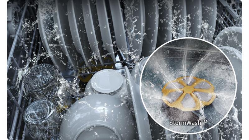 Clean the messiest pots and pans perfectly without the hassle of pre-washing. StormWash™* is a heavy-duty wash system with an extra spray jet that rotates independently from the main spray arm. It blasts high-pressure water from every angle to clean heavily soiled items of all shapes and sizes.1