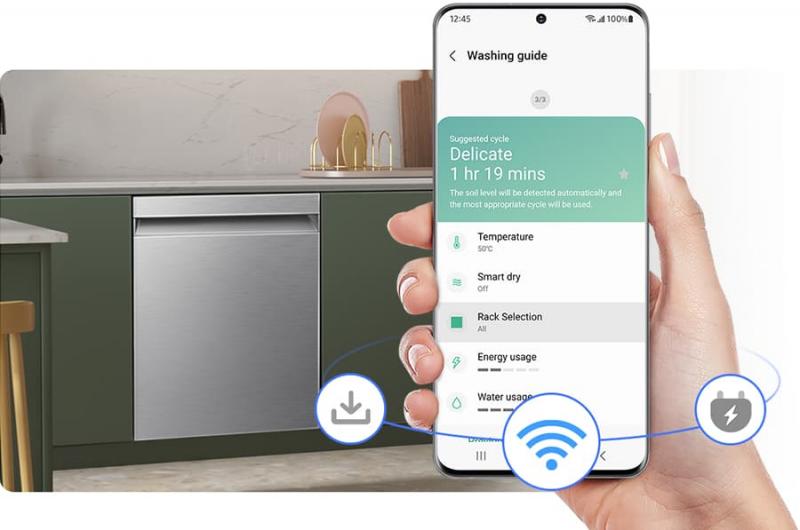 Optimize how you use the dishwasher to suit your lifestyle. The SmartThings App* lets you remotely monitor and control it on a smartphone and download specialist programs. It also suggests courses based on how you cook, while helping you reduce energy use, manage consumables and resolve errors.2