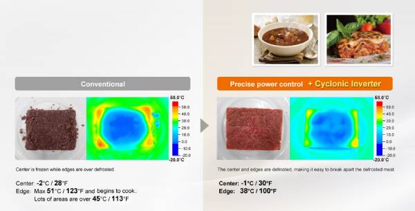 Microwaves in 3D Cyclonic Wave Technology evenly distributes energy throughout the entire cavity and heats any size or shape of food evenly.