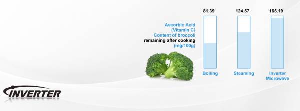 The cooking power and performance of a Panasonic Inverter® Microwave oven has produced significant increases in nutrient levels of certain foods, when compared to other cooking methods such as boiling and steaming.* Not only will your food be ready fast, it will also contain the healthy nutrients you expect. * Data used is a result of Cornell University's Dept. of Nutritional Sciences Study using Panasonic Microwave Ovens vs. Traditional cooking methods.