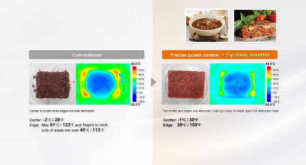 Microwaves in 3D Cyclonic Wave Technology evenly distributes energy throughout the entire cavity and heats any size or shape of food evenly.