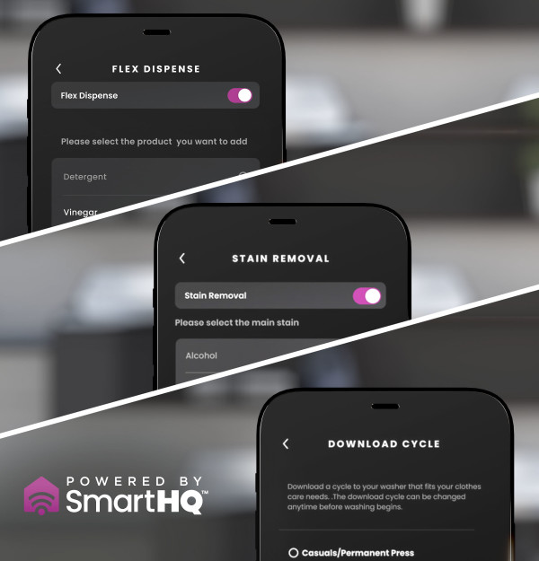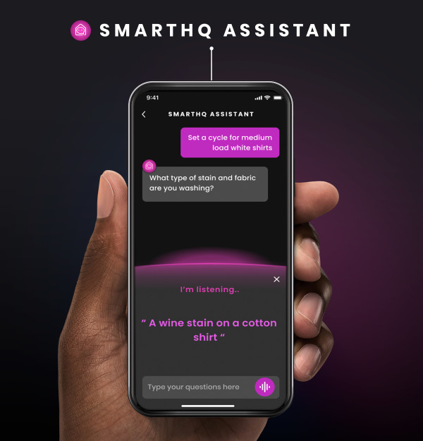 In the SmartHQ App, you can input voice or text commands based off the type of fabric and stains you are washing and SmartHQ Assistant will give you expert recommendations and automatically set your machine for optimal results