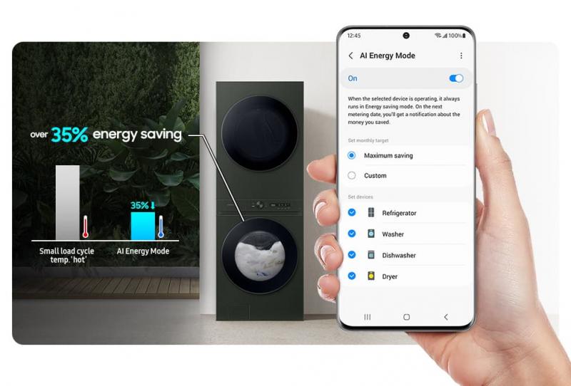 * Available on Android and iOS devices. A Wi-Fi connection and a Samsung account are required. ** SmartThings Energy currently works with around 40 Samsung home appliances that are SmartThings enabled. These include washing machines, clothes dryers, dish washers, air conditioners, air purifiers, vacuum cleaners, ovens, hoods, cooktops, microwave, TVs (from June 2022) and energy meters.