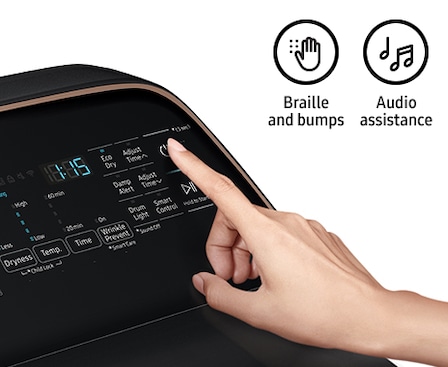 Aiding the visually and hearing impaired, your washer and dryer now features audio assistance, playing a different sound for each option, and braille right next to key control panel buttons.