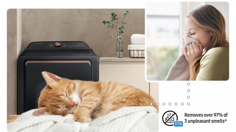 Keep your laundry smelling fresh, even with pets around. The Pet Care Dry Cycle helps remove 97% of 3 unpleasant odors* caused by animal food, messes and body odor.