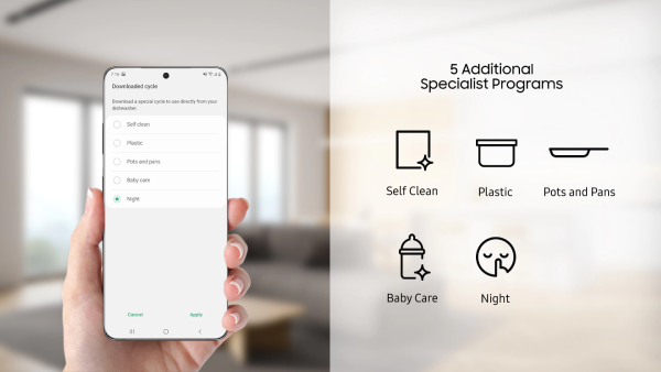 Customize your cleaning experience whenever you want.The Download Cycles option lets you choose from 5 additional specialist programs and download the one you want using the SmartThings APP.Simply select "Night","Self Clean","Pots and Pans","Plastic","Baby Care" cycle.