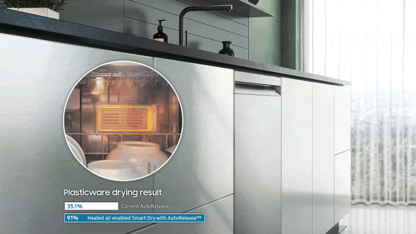 Dry dishes effectively* every time with heated air enabled Smart Dry with AutoRelease™. It absorbs moisture and circulates high temperature air. It also intelligently adjusts the drying temperature and time to avoid wasting energy. And, when cycles end, the door opens for faster, better drying.